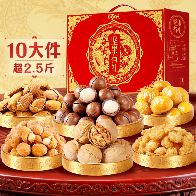 百草味 10件含4坚果礼盒夏威夷果巴旦木核桃休闲零食送礼送长辈新年礼盒