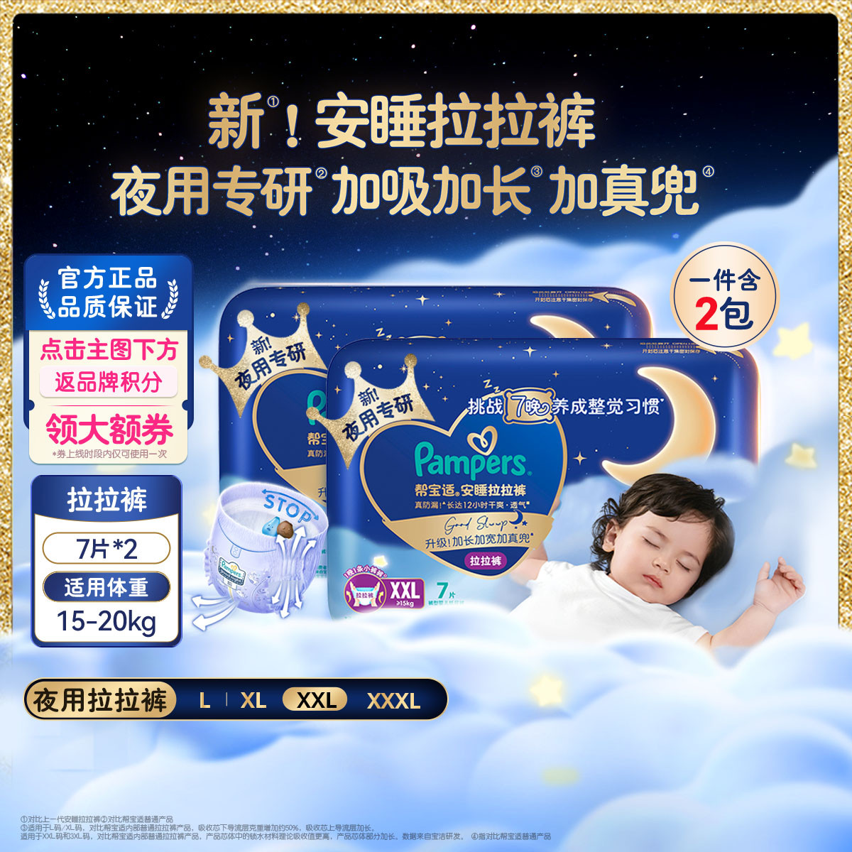 帮宝适 【夜用专研】安睡拉拉裤L-3XL婴儿尿裤超薄透气尿不湿