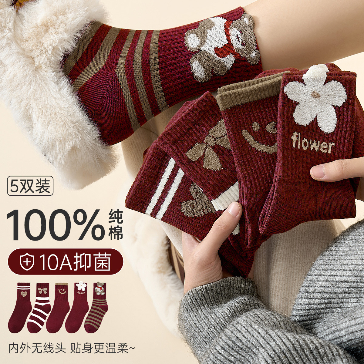 芬腾 【100%纯棉鸿运】5双秋冬季女士中筒袜子女袜本命年运动保暖